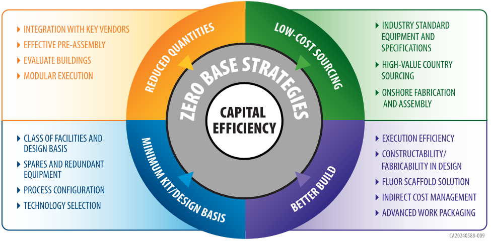 Our clients continue to face project design and execution challenges that focus on minimizing capital intensity. Leveraging our extensive project experience, Fluor works collaboratively with clients to support this objective. Over the last 10 years, Fluor has developed and implemented a concept called Zero-Base ExecutionSM (ZBE), which combines elements of our project execution toolkit to align with client business drivers to build a zero-base design meeting those drivers without excess. When properly implemented ZBE provides the following results: